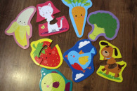 3) Duże puzzle z grubego kartonu z motywem zwierząt, owoców i warzyw (łącznie 8 sztuk, marki TREFFL)
