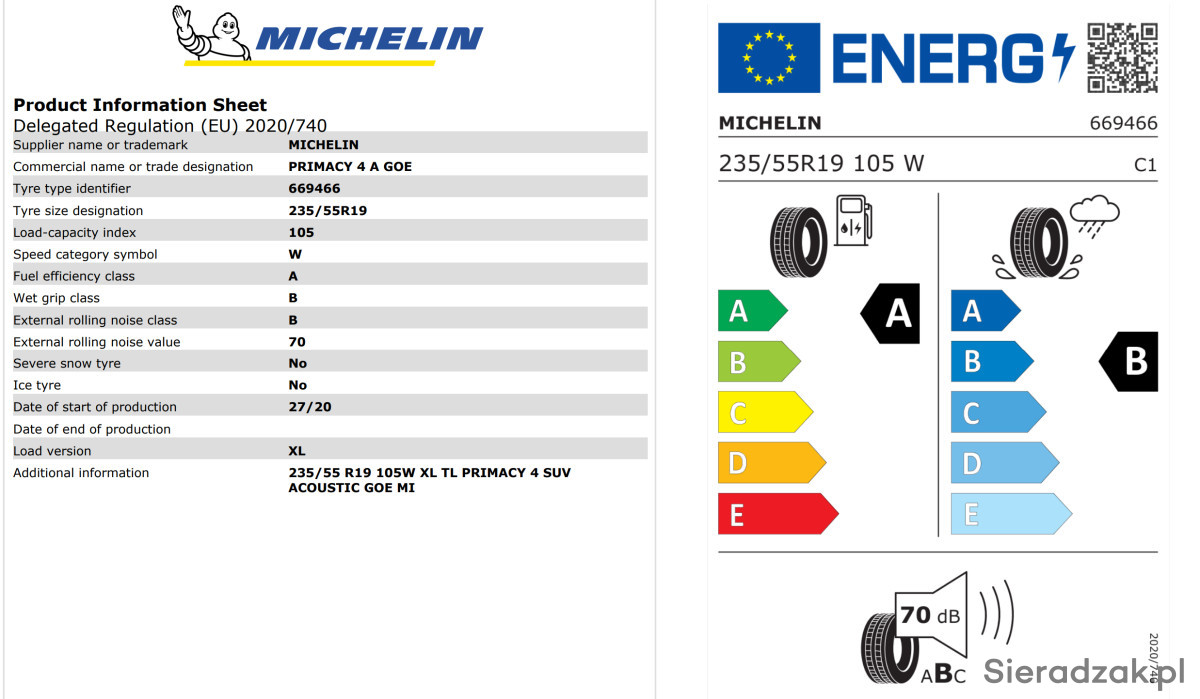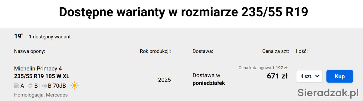 Sprzedam 4 szt.uki Opony Michelin Primacy 4 235/55R19 105 W - opony nowe zdjęte z nowego samochodu przed wyjazdem z salonu - zamiana na wielosezonowe. Cena łączna za 4 sztuki - sprzedaje tylko komplet. Telefon 609 500 580