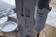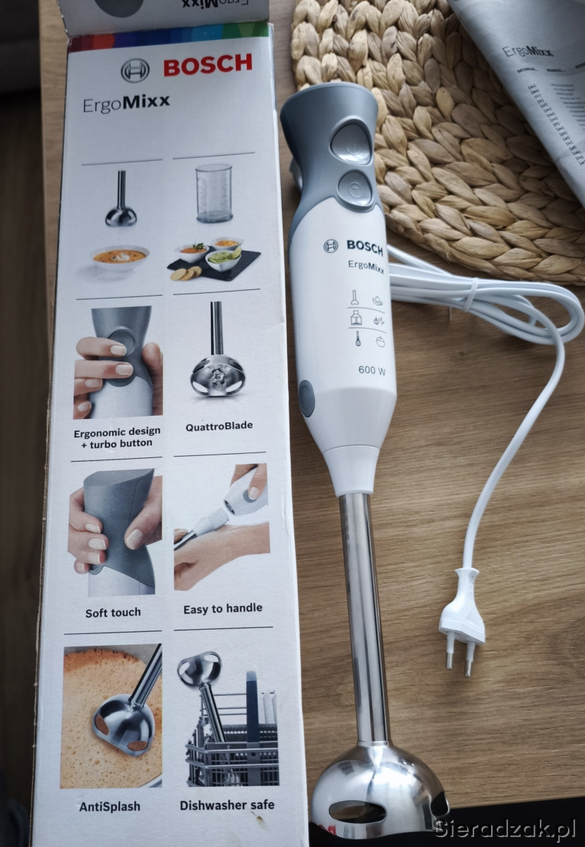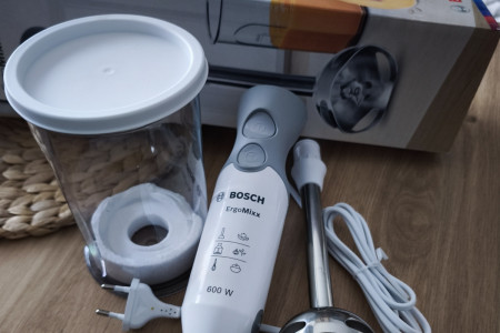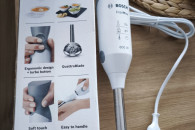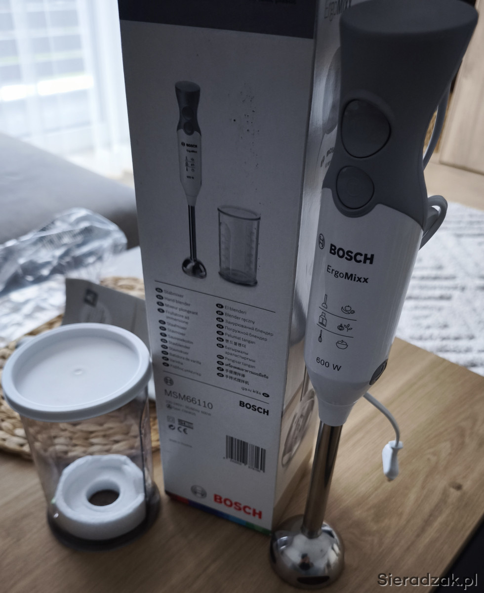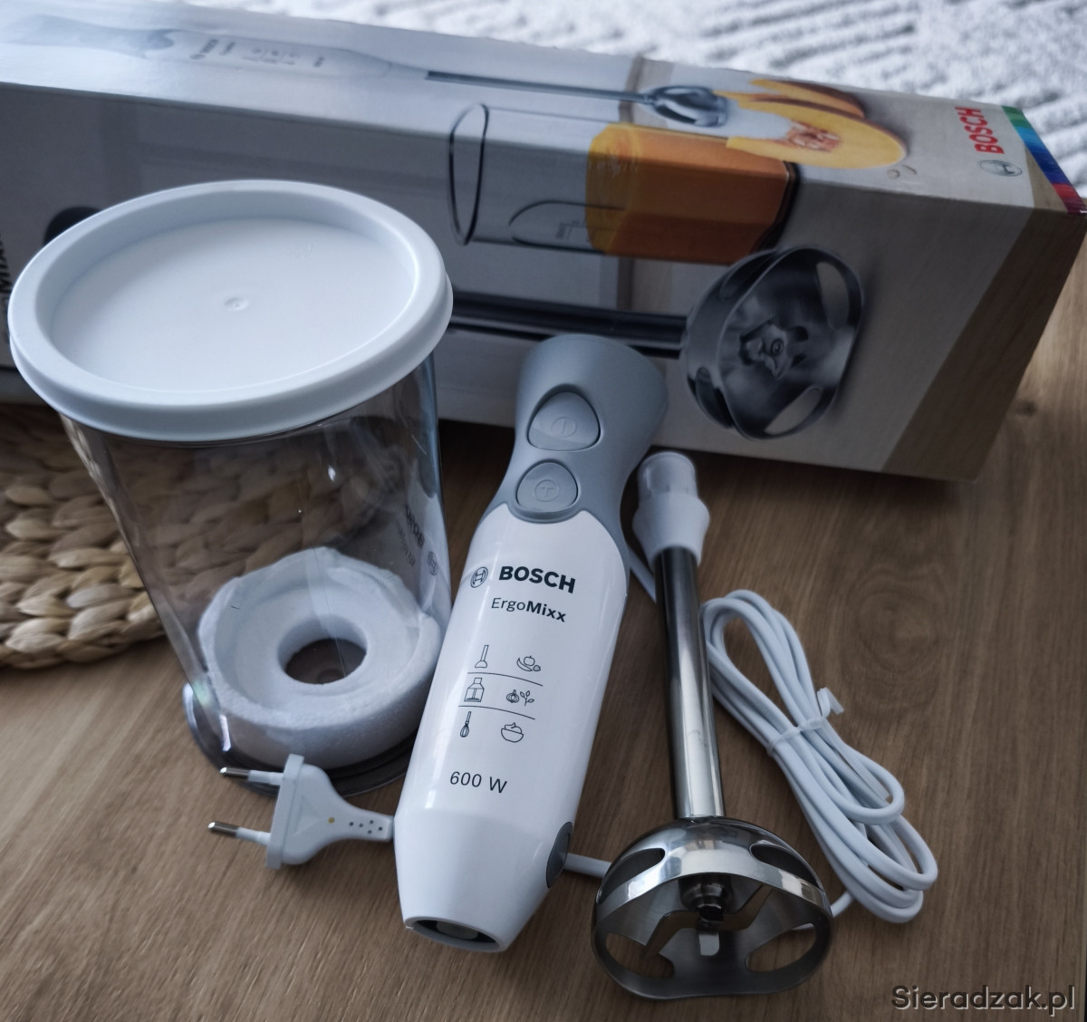 Nowy ręczny blender marki Bosch z pojemnikiem. Doskonałe narzędzie do szybkiego i łatwego mieszania składników. Idealny do przygotowywania koktajli, zup czy sosów.