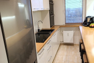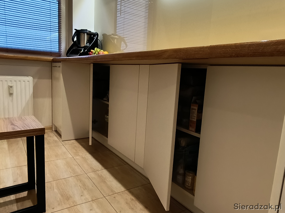* kuchnia z pozostawionymi meblami i sprzętem w zabudowie