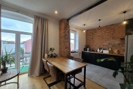 Stylu nadają podłogi wyłożone deską barlinecką, ozdobna cegła na ścianach nadaje charakteru wnętrzu. Oryginalne, drewniane stoły i meble pozostają na wyposażeniu mieszkania.
