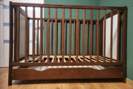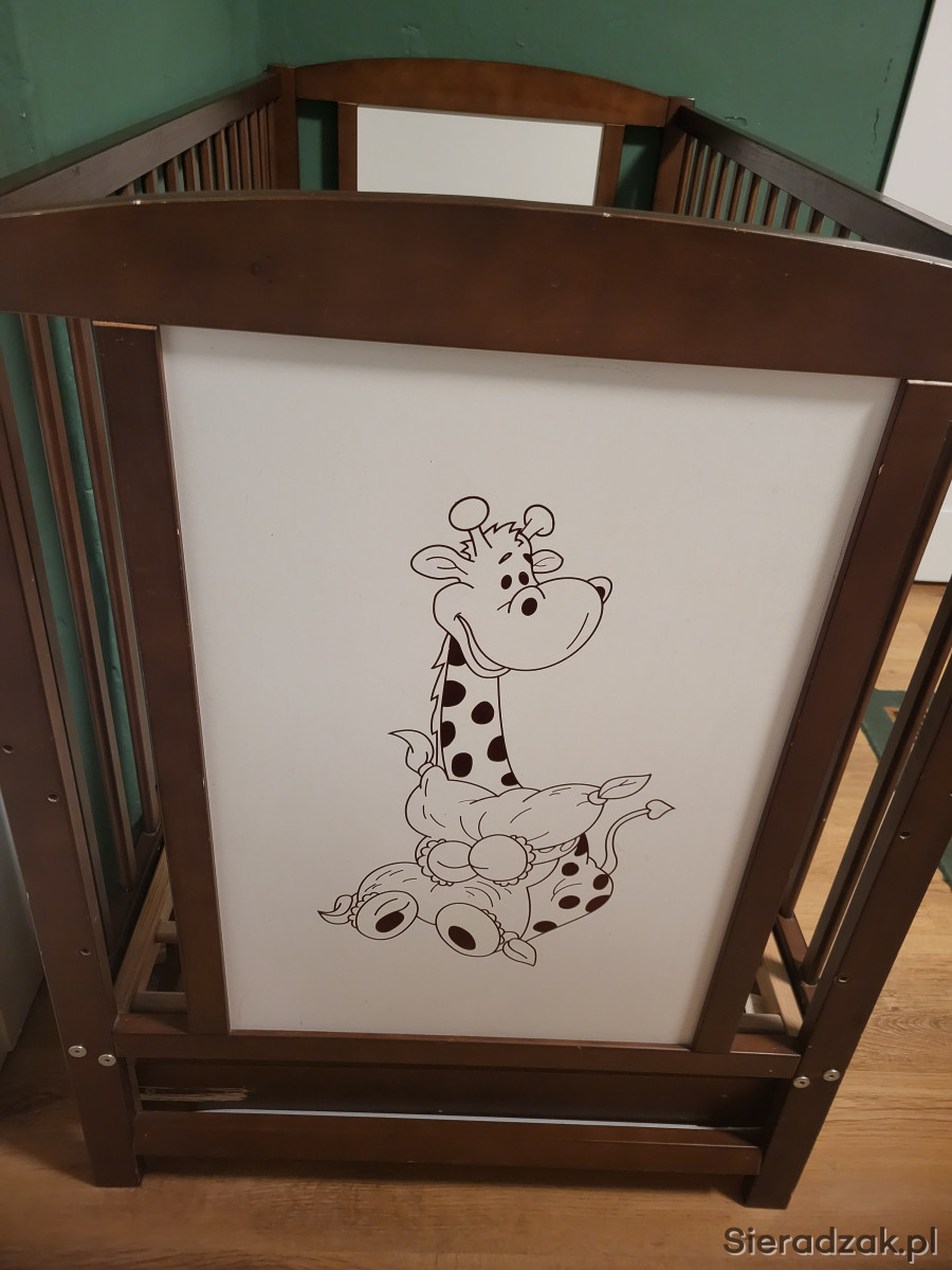 Łóżeczko z motywem żyrafy, posiada szufladę oraz niewielkie ślady użytkowania.