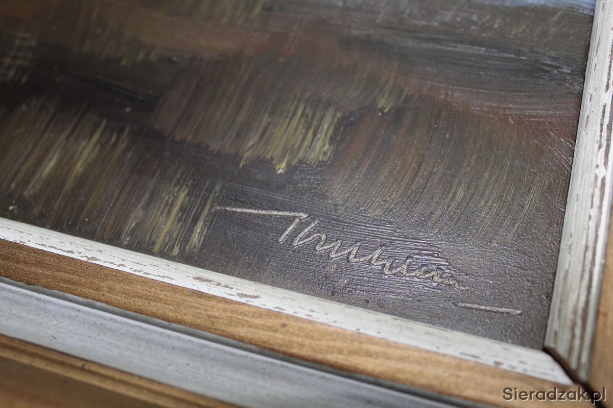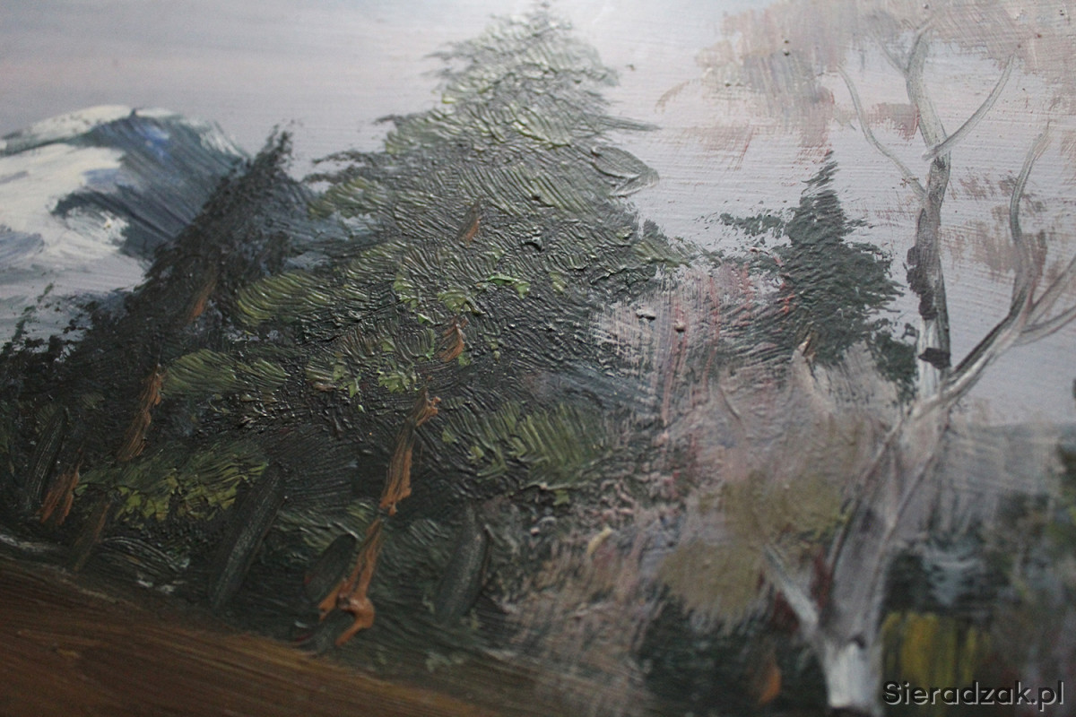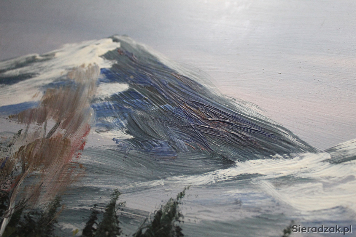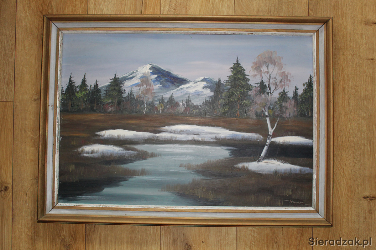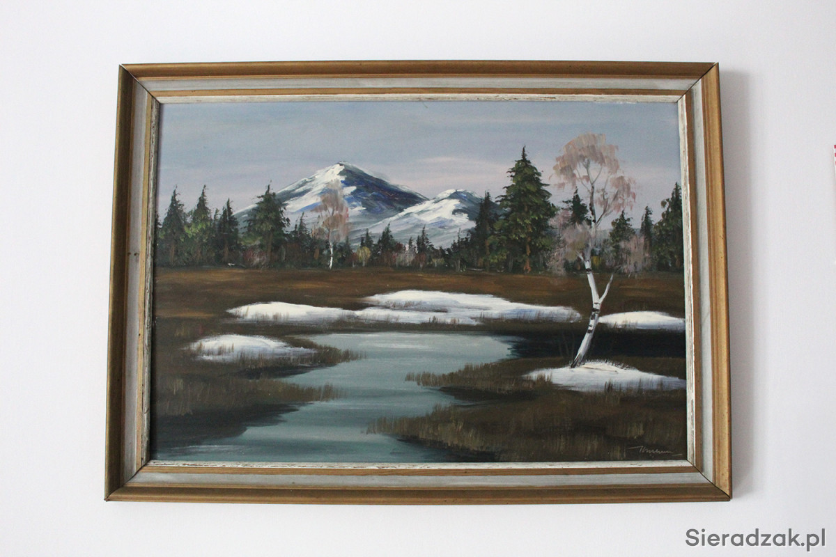 Sprzedam piękny, spokojny pejzaż z widokiem na zaśnieżone góry. Obraz jest stary, ręcznie namalowany przez artystę (najprawdopodobniej europejski), którego podpis został złożony w prawym dolnym rogu. Wygląda, że są to farby olejne. Spore wymiary: 73,5 cm x 53 cm (wymiary z ramą) z możliwością zawieszenia na ścianę.