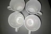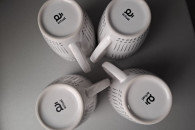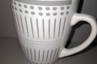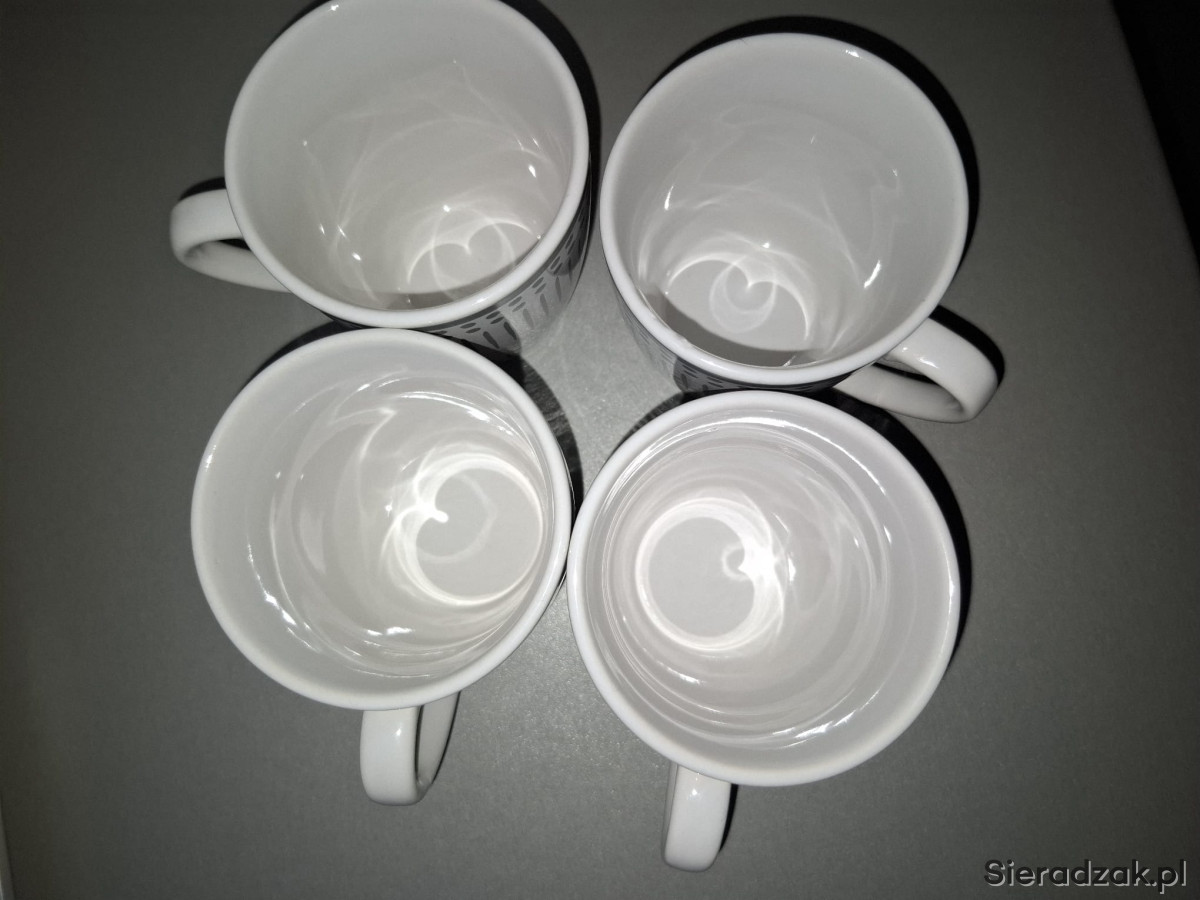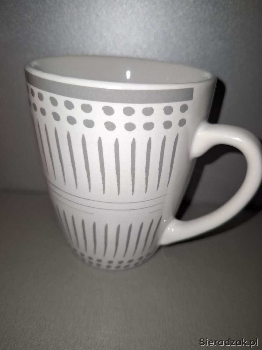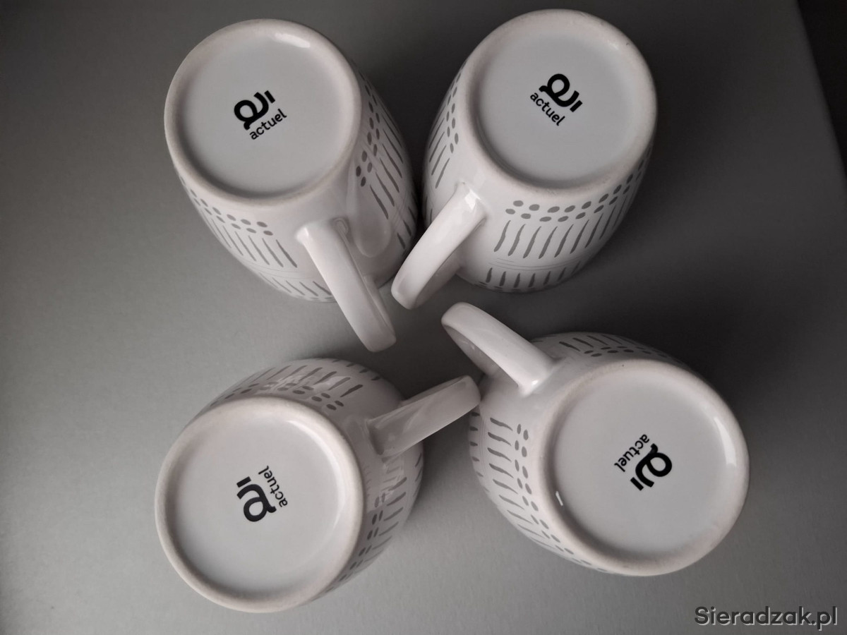 Zestaw 4 nowych kubków z geometrycznym wzorem w kolorze białym i szarym. Kubki mają pojemność około 300 ml i są wykonane z wysokiej jakości porcelany, co gwarantuje trwałość i wytrzymałość. Idealne na codzienne użytkowanie lub jako praktyczny dodatek do kuchni.