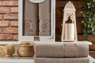Wyjątkowy zestaw ręczników frotte, wykonany w 100% z naturalnej bawełny. Ręczniki zdobią materiałowe bordiury z dużym, mieniącym się haftem. Klasyczny design dopełni każde wnętrze, a stylowa kolorystyka kolekcji przypadnie do gustu zarówno mężczyznom, jak i kobietom.