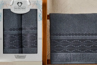 Wyjątkowy zestaw ręczników frotte, wykonany w 100% z naturalnej bawełny. Ręczniki zdobią materiałowe bordiury z dużym, mieniącym się haftem. Klasyczny design dopełni każde wnętrze, a stylowa kolorystyka kolekcji przypadnie do gustu zarówno mężczyznom, jak i kobietom.