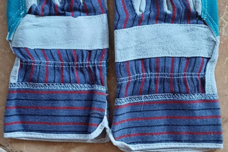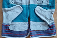 Rękawice ochronne wzmocnione różnokolorową skórą licową, przeszywane na części chwytnej, część wierzchnia drelich w paski.