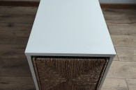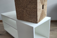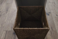 Stolik jest mobilny, z przegródką, która zapewnia dodatkowe przechowywanie. Połączyć go można z koszykiem, który również jest w zestawie. Obecny tutaj koszyk jest wykonany z trawy morskiej, pleciony ręcznie, który dodaje niepowtarzalny kontrast.