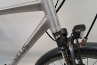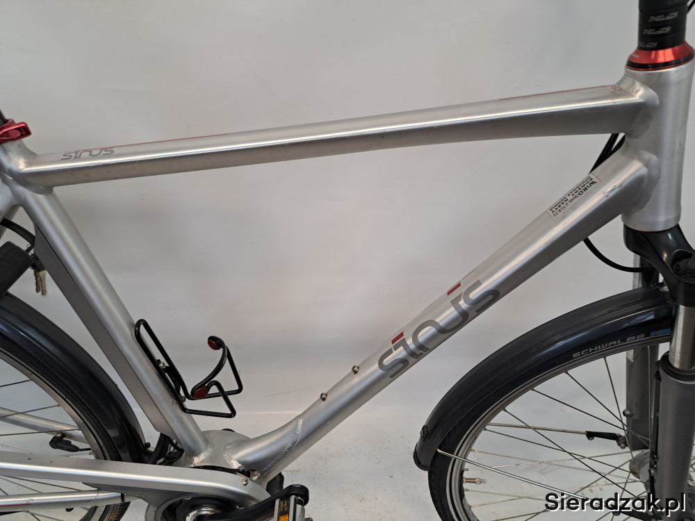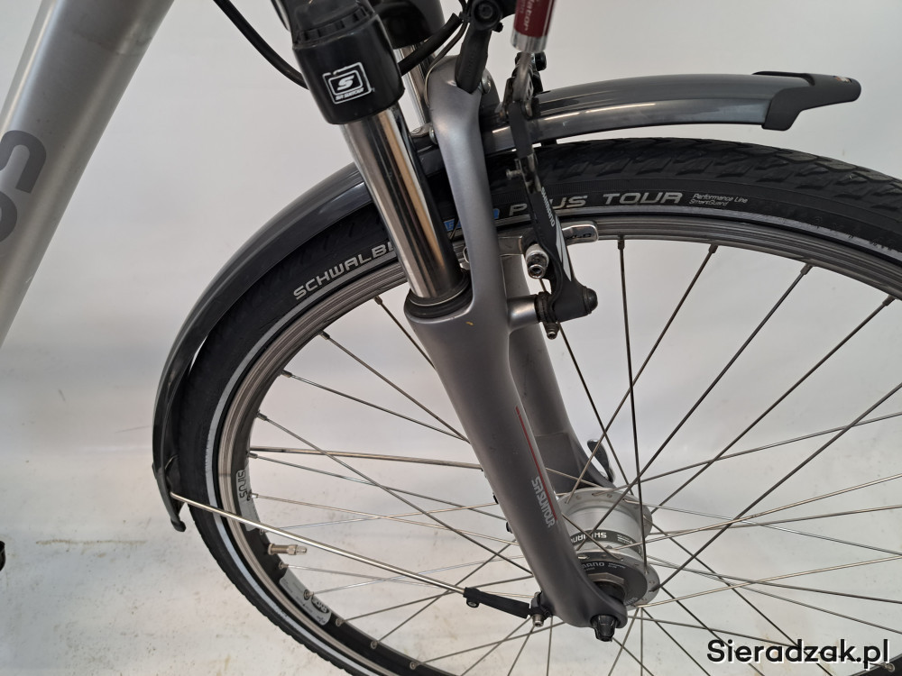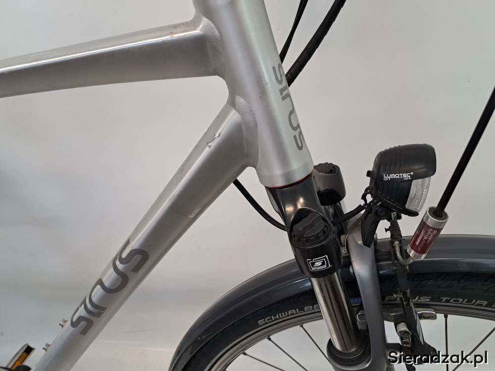 rama aluminium 22" 56cm (XL),przerzutka planetarna sram dual drive 3 biegi w piaście + napęd 9-rzędowy,hamulce v-brake shimano,manetki sram dual drive,oświetlenie lumotec zasilane z dynama shimano w przednim kole,siodełko selle royal z amortyzowaną sztycą podsiodłową,zabezpieczenie tylnego koła abus,amortyzator sr suntour nex 4110.