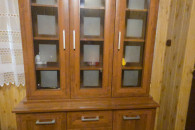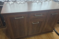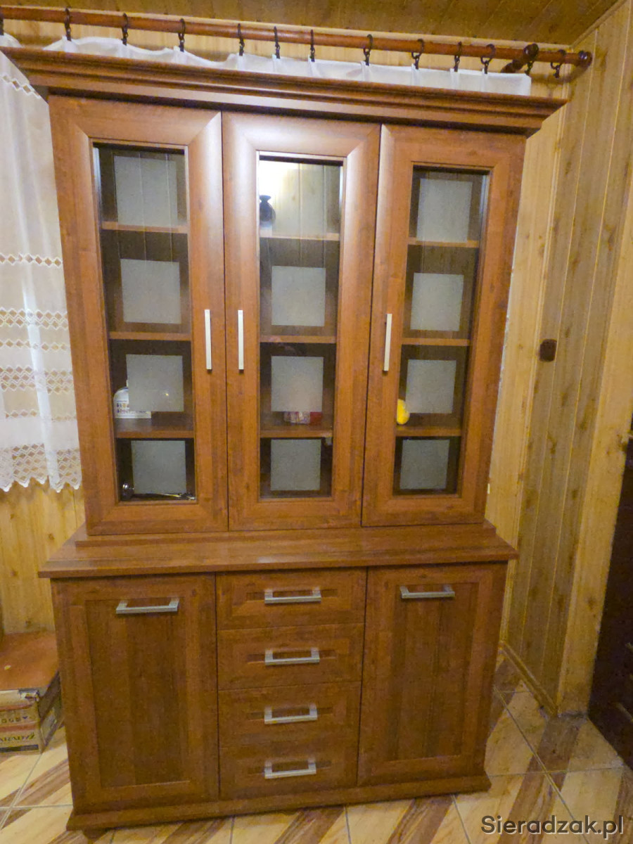 Solidne dwie komody z szufladami i drzwiczkami oraz witryna stawiana na jednej z komód w ciemnym kolorze drewna. Idealne do przechowywania rzeczy w salonie lub sypialni. Meble używane, ale w bardzo dobrym stanie. Wymiary to około: szerokość: 122cm, głebokość: 48cm, wysokość komód dolnych: 82 cm , natomiast tej z witryną łacznie z dolną to 197cm. Cena za całość. W razie pytań lub potrzeby przesłania dodatkowych zdjęć zapraszam do kontaktu.