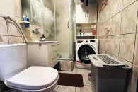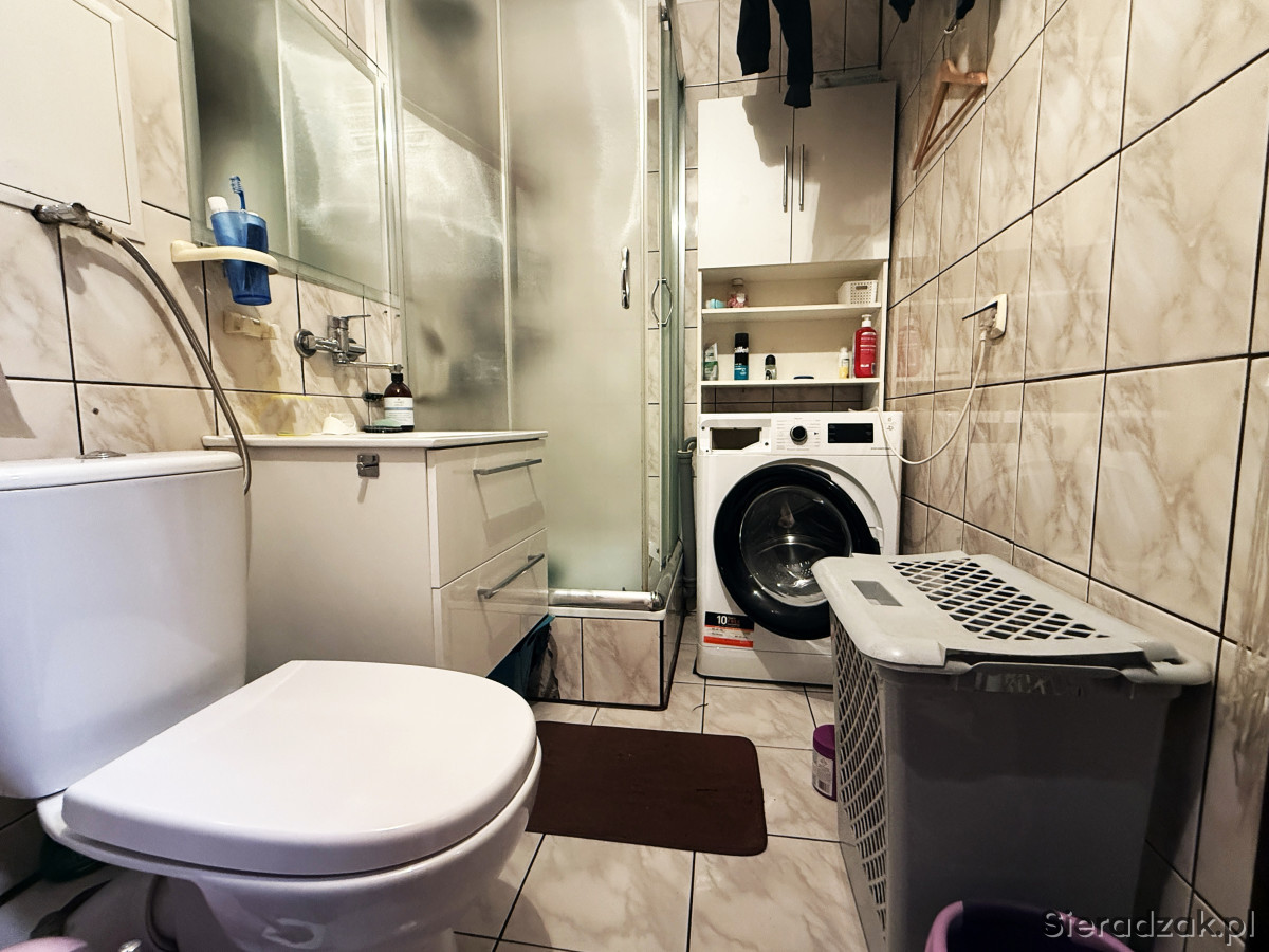 ŁAZIENKA Z WC: Na wyposażeniu znajduje się prysznic, toaleta, szafka, umywalka oraz lustro. Cała w glazurze starszego typu.