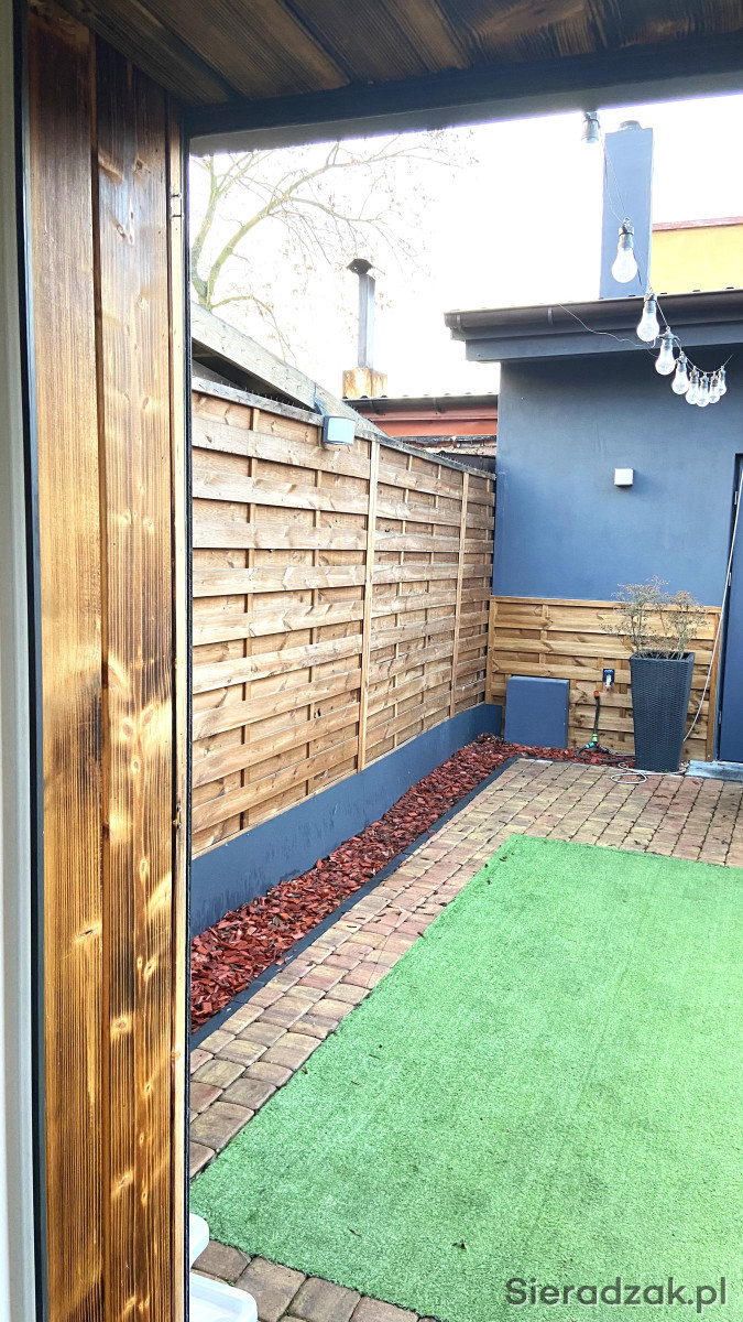 Domy połączone są klimatycznym, oświetlonym tarasem o wymiarach 6x6 m. Tworząc zadaszenie, możemy otrzymać fantastyczny zimowy ogród. Bezpieczeństwo zapewniają monitoring, system alarmowy oraz zewnętrzne antywłamaniowe rolety.