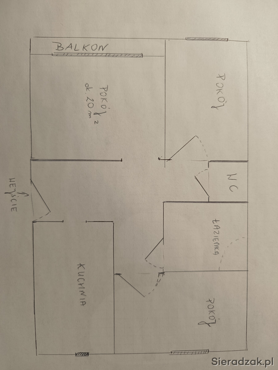 Mieszkanie na 4 piętrze , 3 pokojowe, środkowe, metraż 56 m, z dużym balkonem typu loggia od strony południowej.
