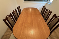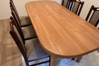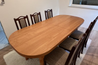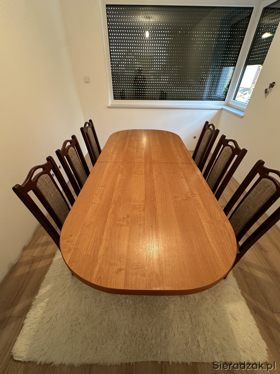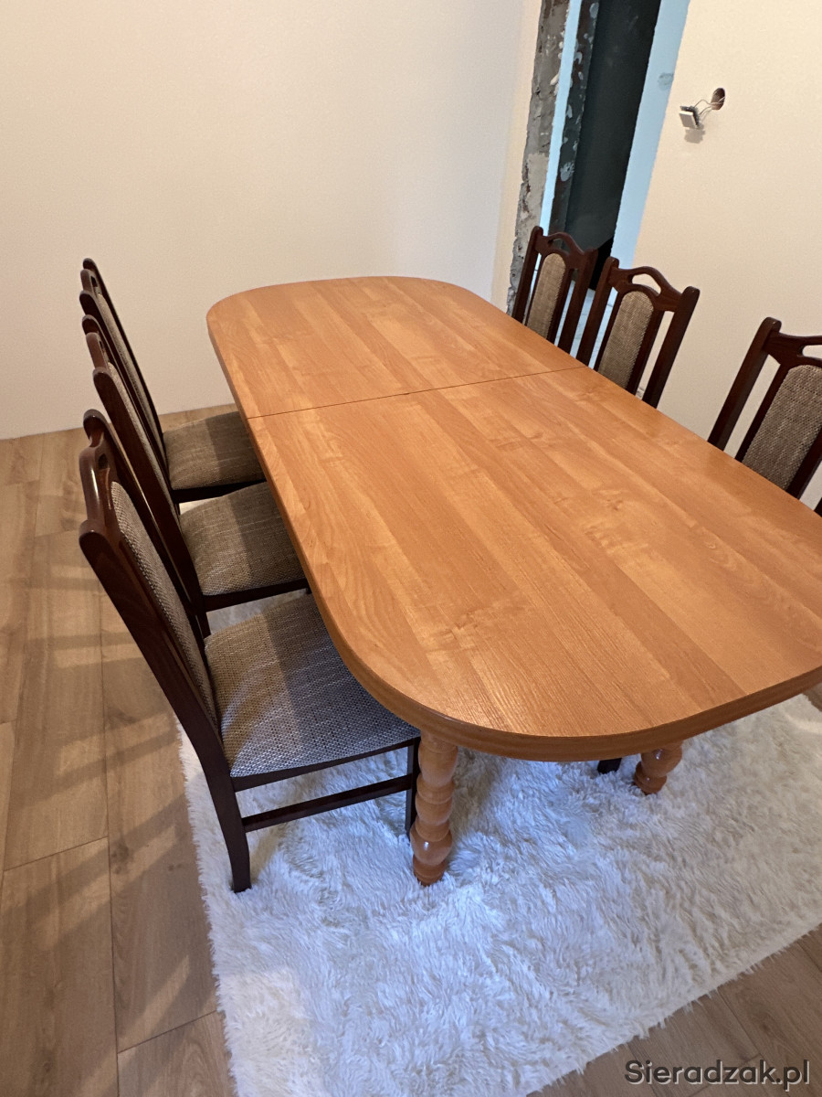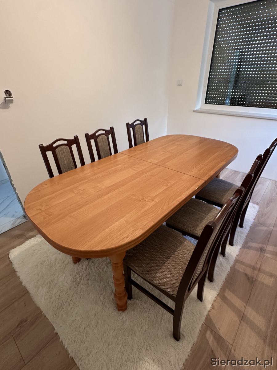 Drewniany stół z sześcioma krzesłami w bardzo dobrym stanie. Idealne do jadalni lub kuchni. Wymiary stołu to 90cm x 200cm (po rozłożeniu 250cm)- cena 350,00zł. Krzesła ciemny brąz, 6 sztuk x150,00 zł. Istnieje możliwość zakupu stołu i krzeseł oddzielnie. Zainteresowanych zapraszam do kontaktu.