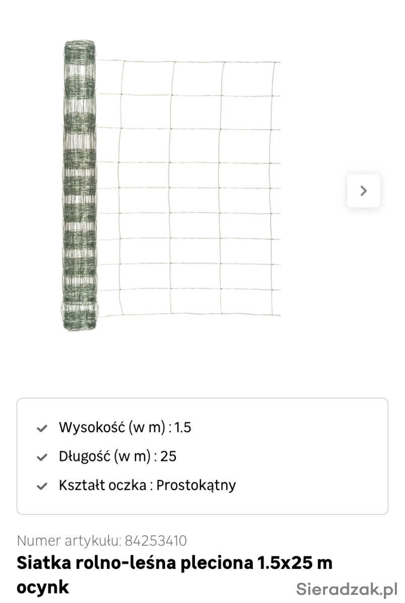 Sprzedam siatkę rolno - leśną ocynkowaną plecioną. Wysokość 1,5 m. Długość 25 m.