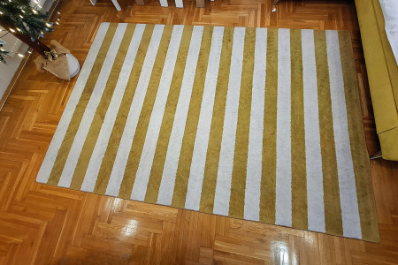 Sprzedam dywan w złoto-białe pasy o wymiarach 200x290 cm.