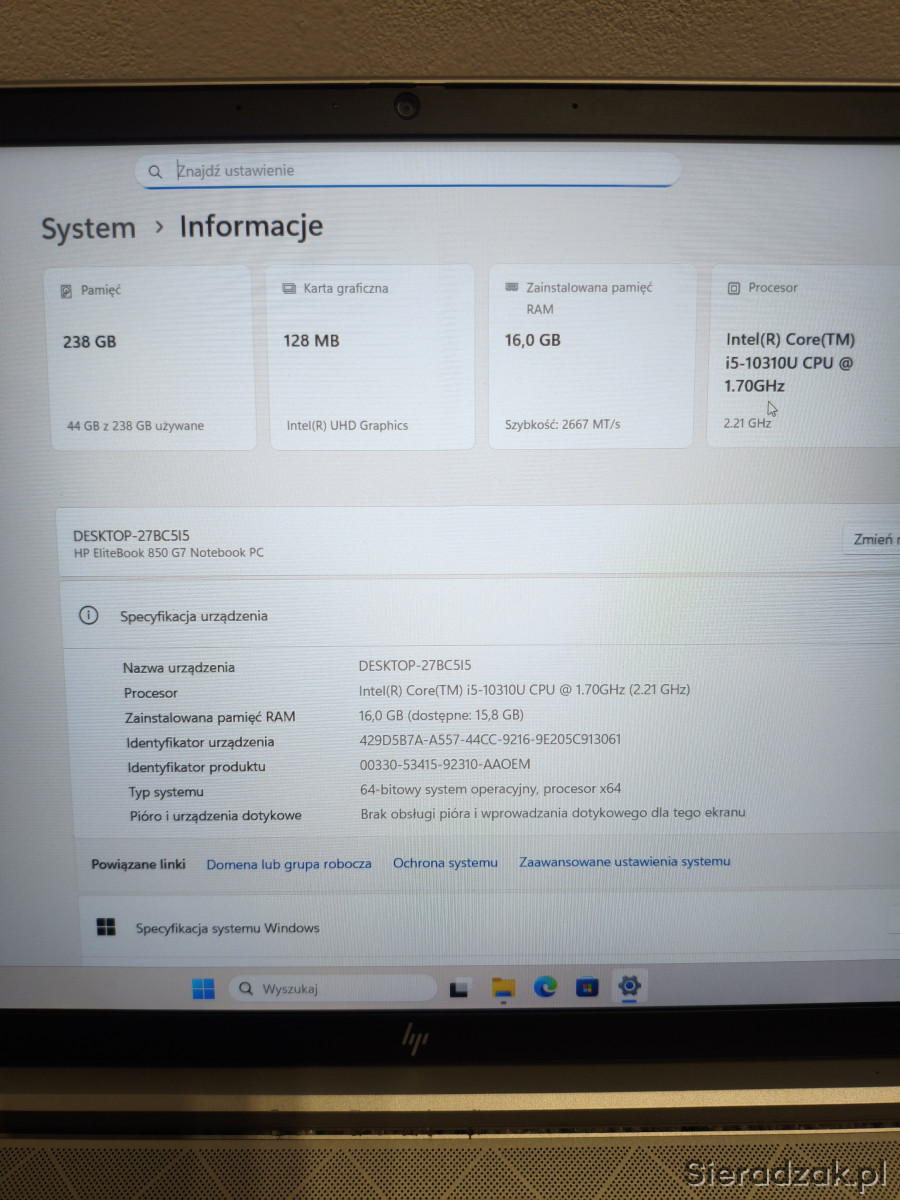Na sprzedaż laptop premium, HP Elitebook 850 G7, jest to świeży oraz szybki sprzęt ponieważ posiada procesor i5-10 generacji, 16GB Ram DDR4 oraz 256GB dysk SSD M2 Nvme (jest możliwość dołożenia u mnie pamięci ram do 32gb jak i wymiana dysku na 512gb bądź 1tb).