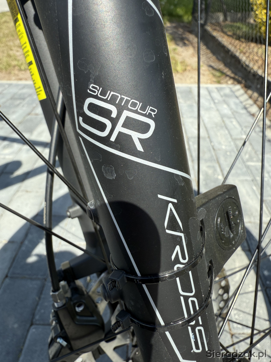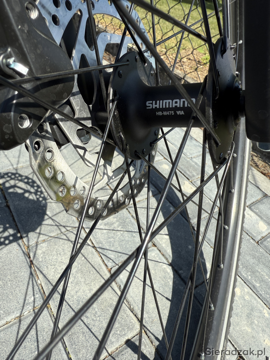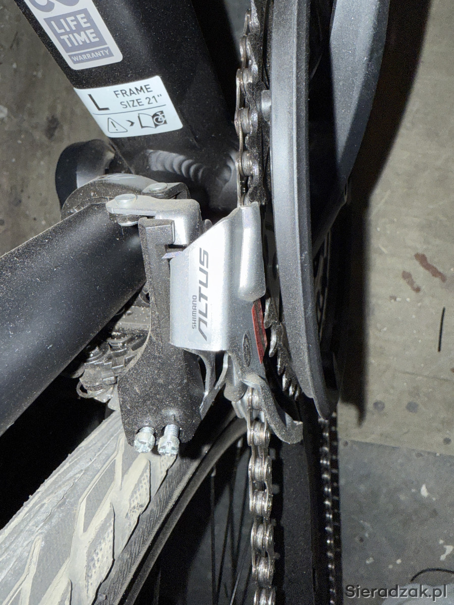 Hamulce tarczowe-hydrauliczne, przerzutka przednia SHIMANO ALTUS x3, przerzutka tylna DEORE x9, piasty SHIMANO osadzone na szybozamykaczach. Przedni widelec amortyzowany-regulowany. Siodełko amortyzowane.