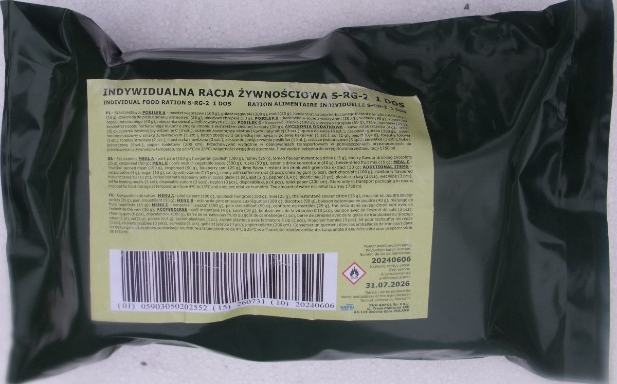 Trzydaniowa racja żywnościowa S-R, stanowiąca podstawę trzech posiłków tj. śniadania, obiadu i kolacji. Wyposażona w zestaw do samodzielnego podgrzewania.