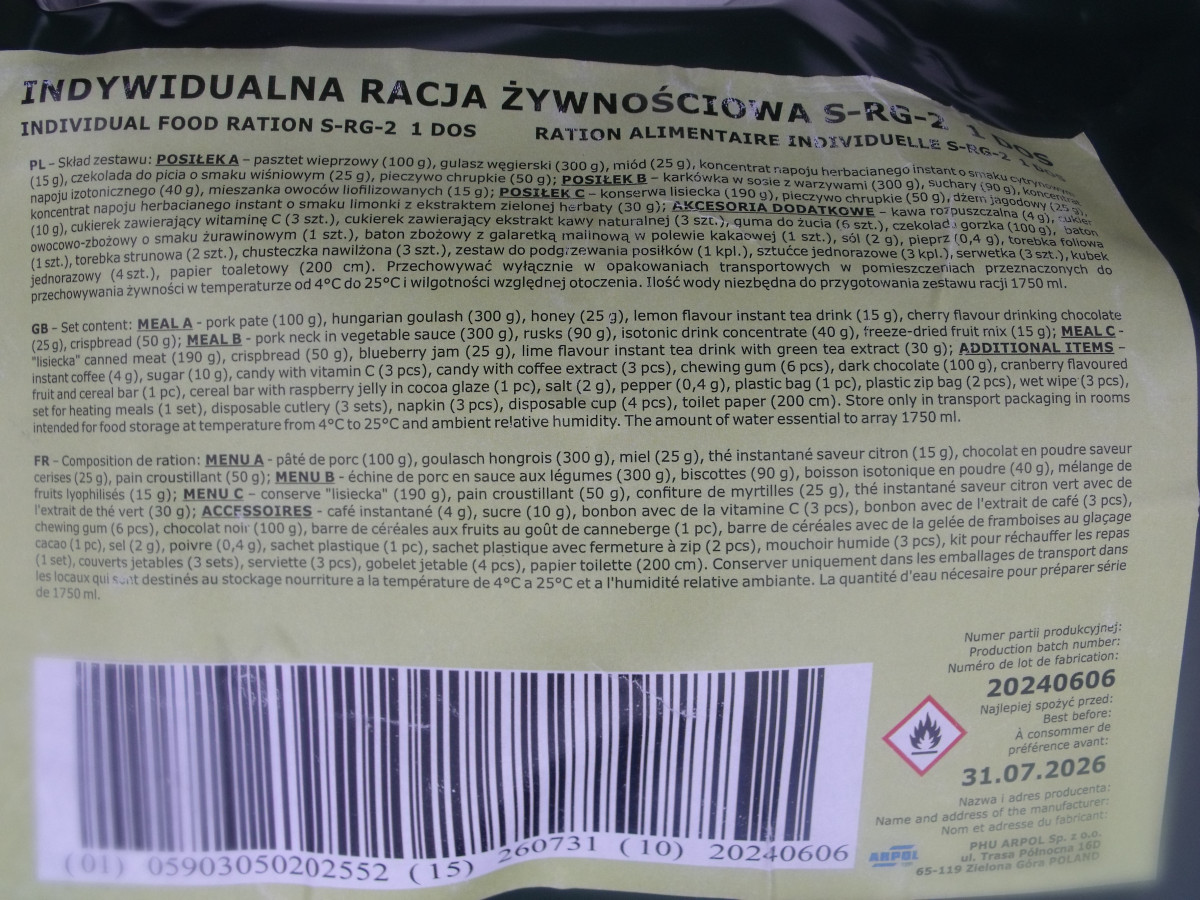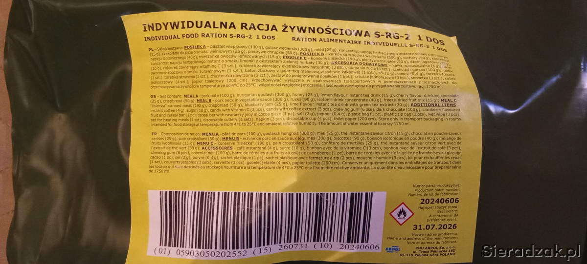 Oryginalna racja żywnościowa polskiej armii S-R (Individual Food Ration)