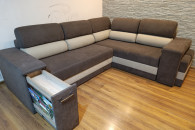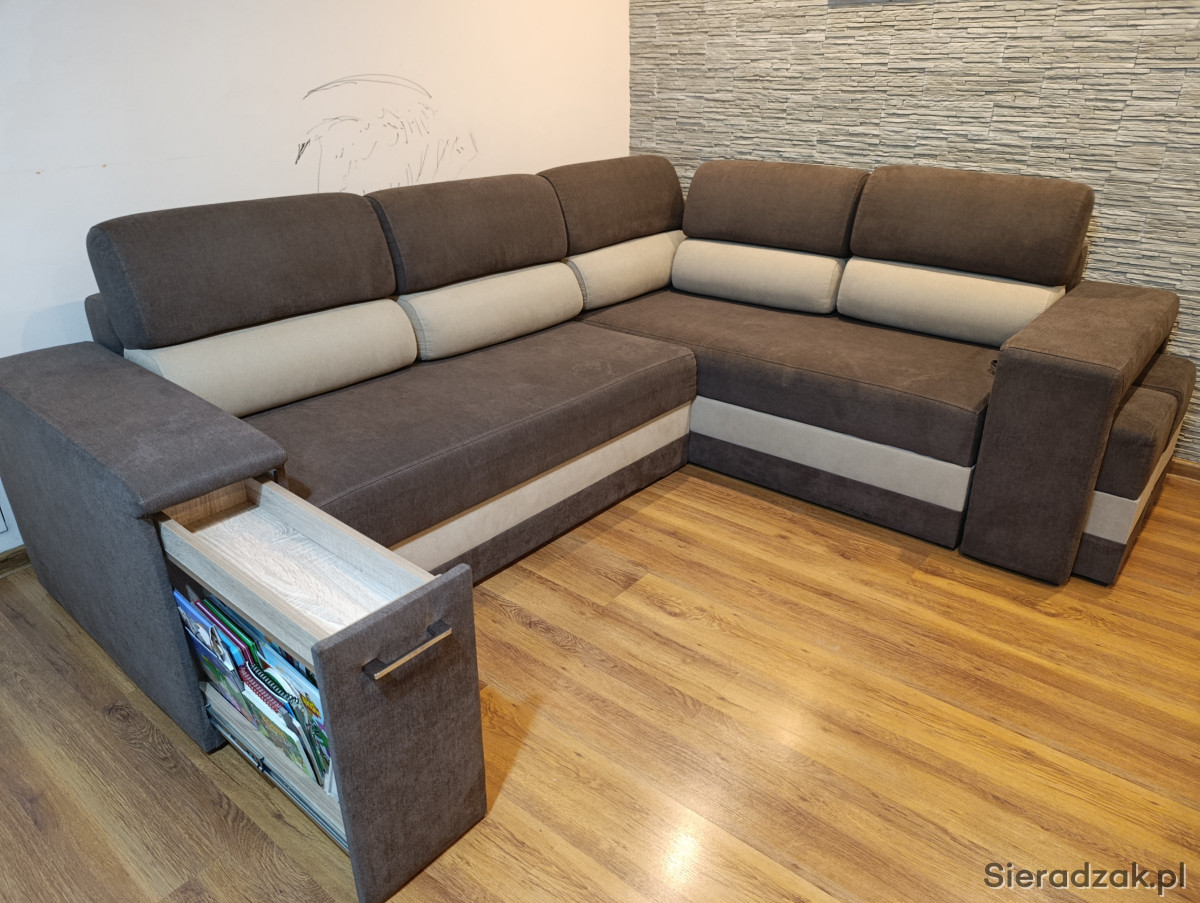 Wygodna, narożna sofa z funkcją spania. Mebel w kolorze brązowym z jasnymi wstawkami, wykonany z trwałych materiałów. Idealna do salonu lub sypialni, zapewniająca komfort i dodatkowe miejsce do spania. Stan bardzo dobry. W narożniku są dwa pojemniki, barek plus dwie pufy.