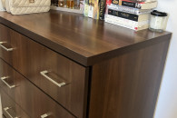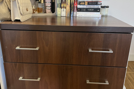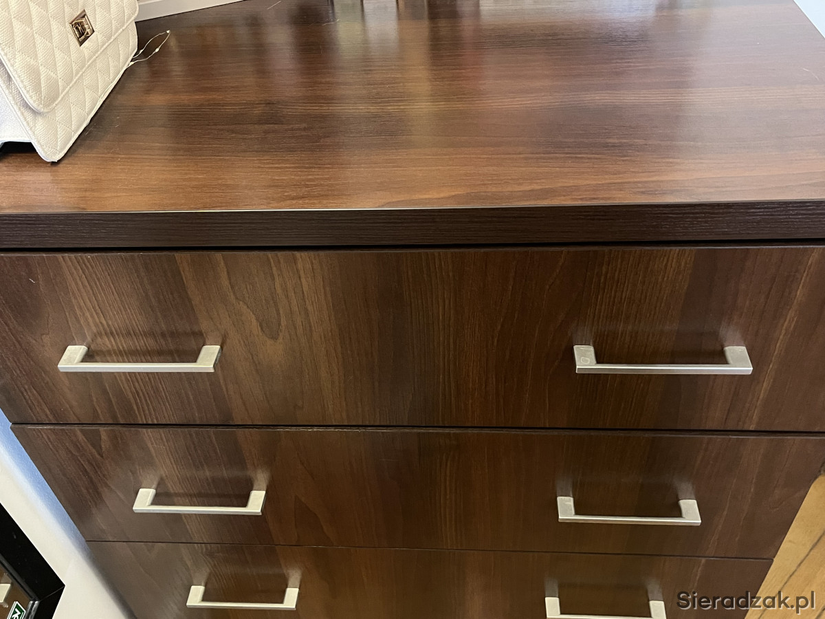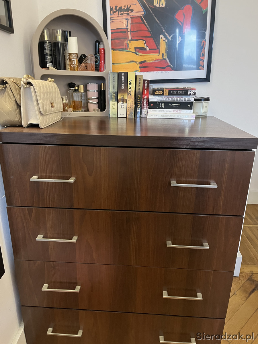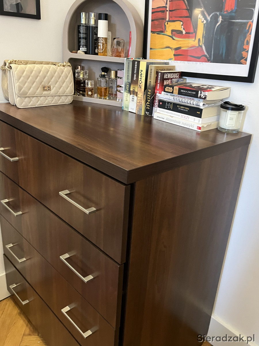 Praktyczny komoda z czterema szufladami marki Ikea. Mebel wykonany z drewna w ciemnym kolorze, w dobrym stanie. Idealnie nadaje się do przechowywania ubrań, bielizny lub innych przedmiotów. Solidna konstrukcja i funkcjonalny design sprawią, że komoda będzie służyć przez długi czas.