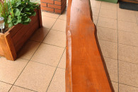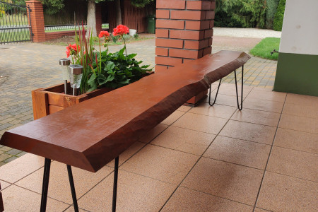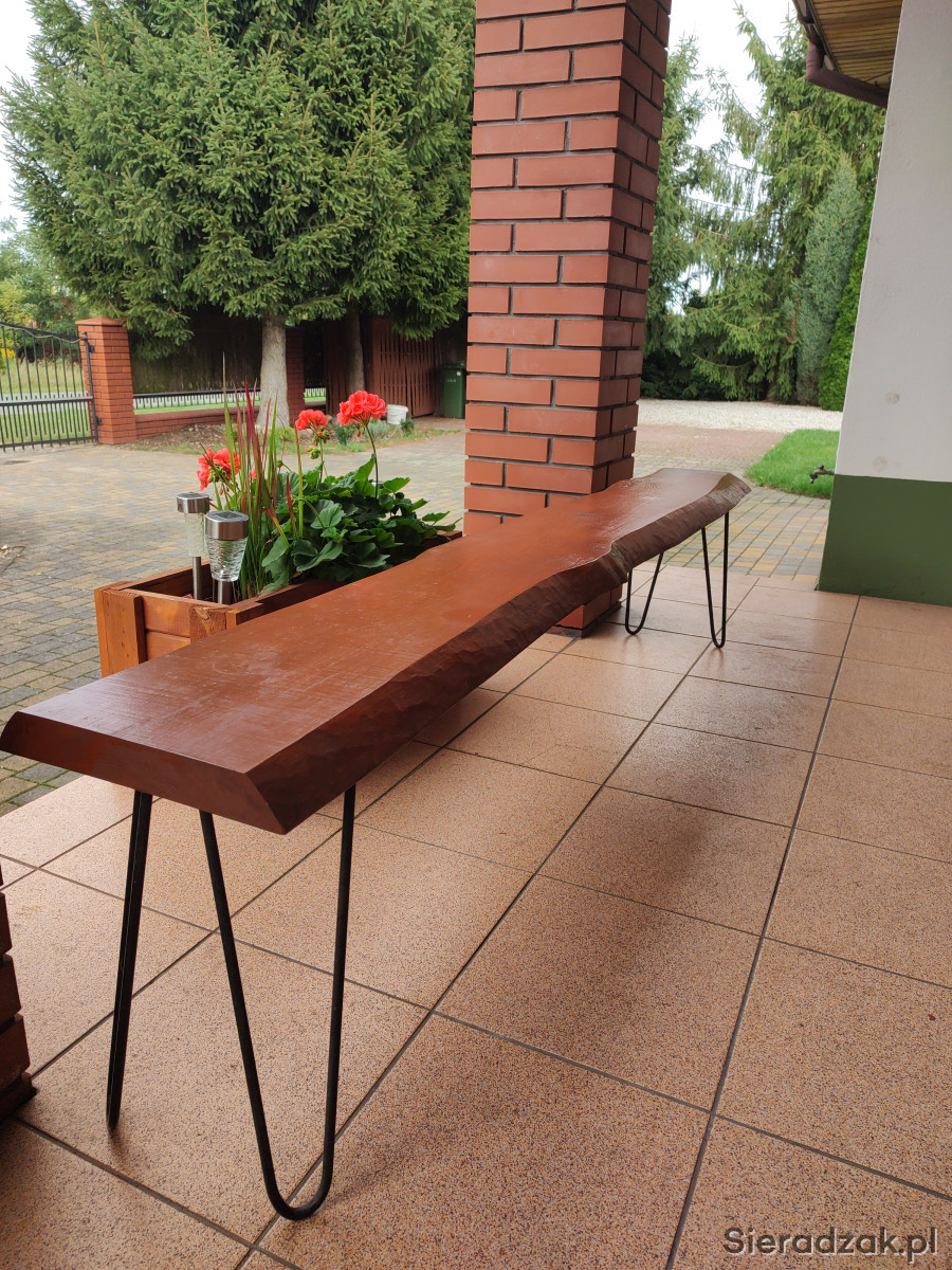 Ławka ogrodowa wykonana samodzielnie z dużą dbałością. Nogi metalowe, deska sosnowa polakierowana. Długość 200 cm, wysokość 50 cm, szerokość 30 cm.